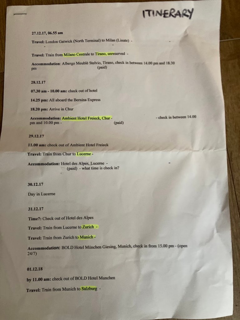 So, working backwards from D-day, I concocted a plan that begun with ‘be somewhere with mountains on January 1st 2018’, and ended up including four difference countries, a train ride through The Alps, a Sound of Music tour bus, a free performance of Wicked The Musical, and an itinerary that required more military precision than I’d ever imagined I was capable of achieving in my wildest dreams. There were only two occasions where it all looked set to implode like an undercooked soufflé: once when I lost my phone, and once when we nearly missed the last train to Munich. Both of these things were either caused by or resulted in better stories than I’d have had otherwise though, so I count that as a success (in retrospect).