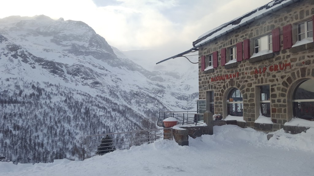 At the start of our ascent there is still the occasional reminder of civilisation: houses, Graubünden railway buildings, power stations. The final echo, at least for the time being, of the world below the mountains, is the Alp Grüm restaurant. It’s an attractive stone building with red shutters, and it’s strikingly dark and solid against the white snow. It hangs over a dramatic 2000 metre drop overlooking the Val Poschiavo valley and the Palü Glacier. The train stops and allows us to get out to have a look. It’s one of the best viewpoints on the line.