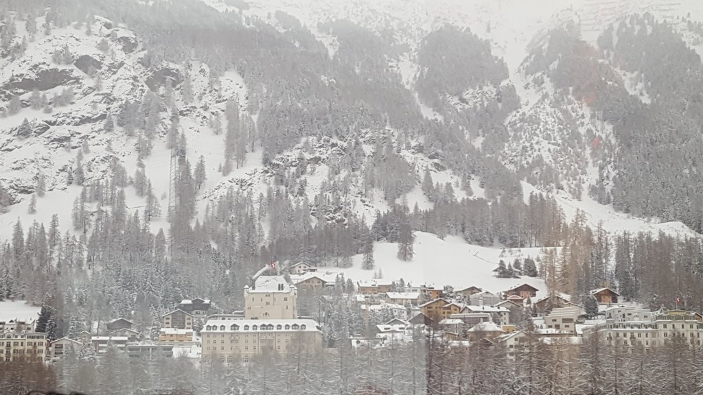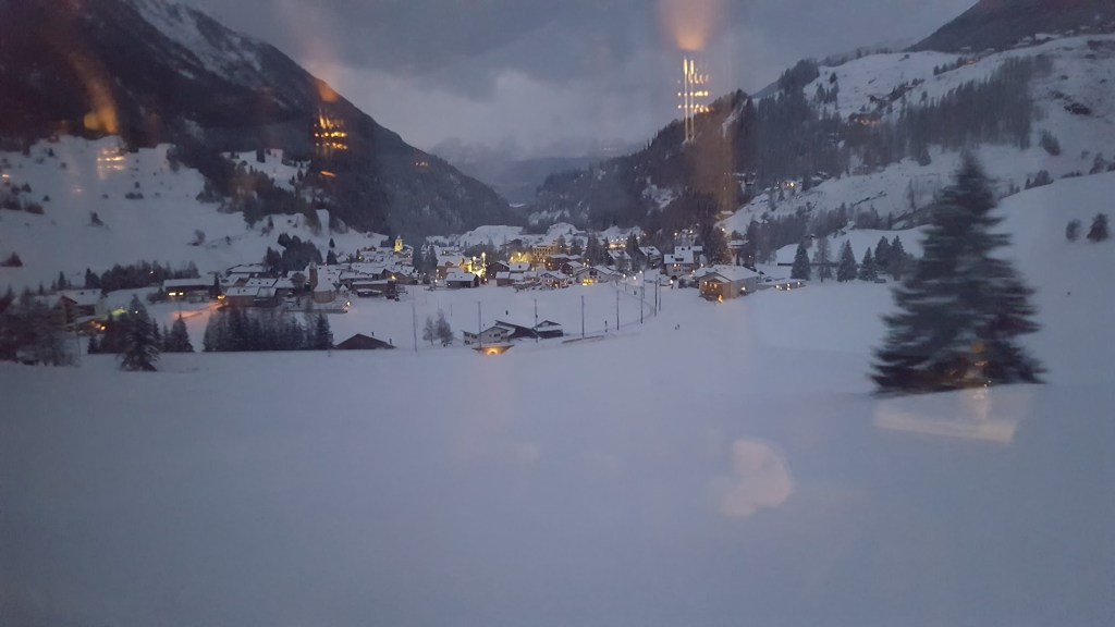 It’s still daylight when we pass through Pontresina, a village nestled amongst pine trees at the foot of the Bernina massif, but by the time we approach St. Moritz, it’s growing dark, and from the distance the cluster of houses with their windows glowing orange look like a picture from a Christmas card.