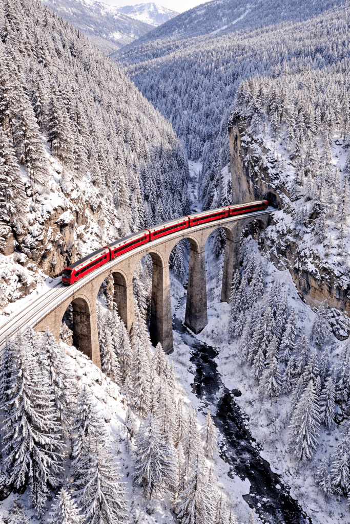 The Bernina Express is a bright red train that winds through the scenic Alps, beginning in Tirano, Italy and ending in Chur, Switzerland. The type of scenery is dramatically different depending on the time of year. In the summertime it is all greenery and wildflowers with the snowcapped mountains in the far distance. In December, it is pure winter wonderland.